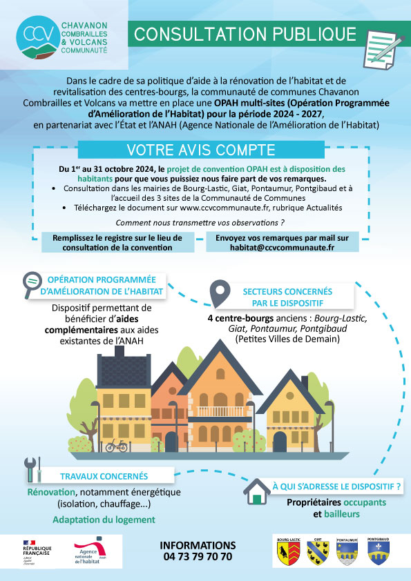Dans le cadre de sa politique d’aide à la rénovation de l’habitat et de revitalisation des centres-bourgs, la communauté de communes Chavanon Combrailles et Volcans va mettre en place une OPAH multi-sites (Opération Programmée d’Amélioration de l’Habitat) pour la période 2024-2027, en partenariat avec l’Etat, l’ANAH (Agence Nationale d’Amélioration de l’Habitat).